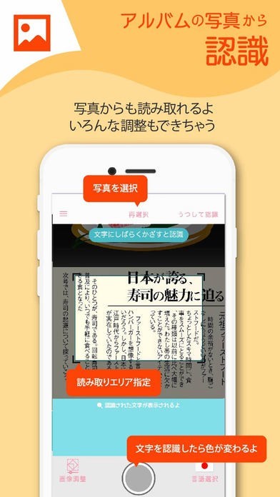 写真を撮るのと同じ手軽さでイメージとしての文字をテキストデータ化できるアプリです!テキストなら検索も簡単!