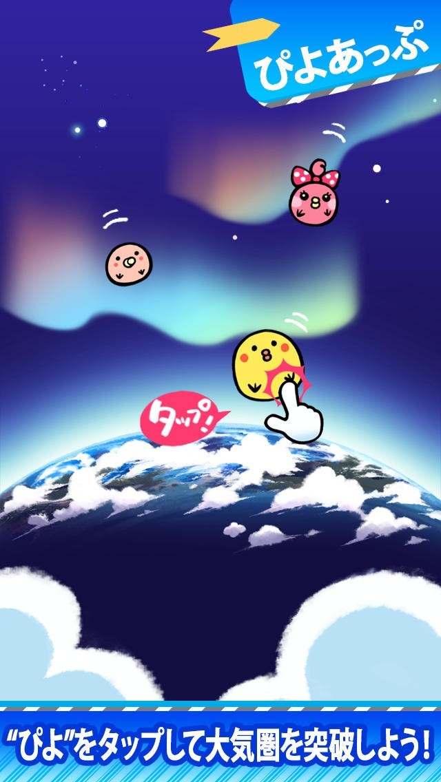 まん丸な姿がとってもカワイイキャラの「ぴよ」と遊べる「ぴよあっぷ」は、空中にパタパタ飛んでくるので地面に落ちないようタップするだけ。 黄色や白、ピンク色のぴよをできるだけ空高く飛ばすことで飛行距離が伸びパワーが溜まるので、そのパワーを使用し宇宙につながる大気圏へ飛ばそう! 途中でヘルプアイテムが出現することがあるので、忘れずにゲットしましょう。また飛ばしている最中に画面いっぱいの大きなぴよが登場するのでタップの連打で対応すると倒せます。