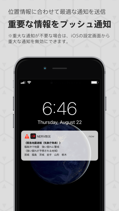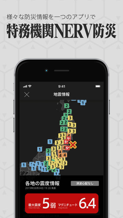 App Storeより引用特務機関NERV防災アプリは、地震・津波・噴火・特別警報の速報や洪水や土砂災害といった防災気象情報を、利用者の現在地や登録地点に基づき最適化して配信するスマートフォン用サービスです。