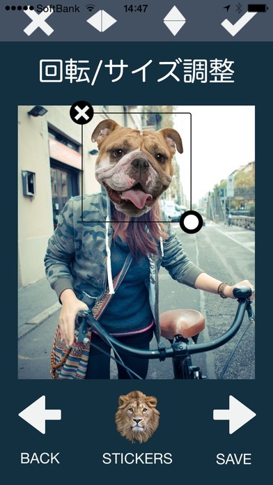 アニマルフェイスは、写真を撮ると人間の顔の部分に動物の顔を入れて加工することができます。動物は約60種類あり、写真を合成します。 写真を撮影するか、ライブラリの写真から加工したい写真を準備します。変身したい動物を選んで、画像の角度に合わせて動物を回転させたり、サイズ変更や上下左右に反転させながら合わせていきます。タップで微調整ができるので、どんな写真にも対応できます。リアルな動物の顔は人間の体にフィットするので、まるで動物が洋服を着て歩いているように見えてきます。カメラに合わせて正面を向いた写真ばかりではないので、動きがあって楽しめます。 完成した写真は、フォトライブラリに保存したり、共有機能でFacebookなどに投稿したり、メール送信して動物が好きな方や友達と一緒に楽しむことも可能です。