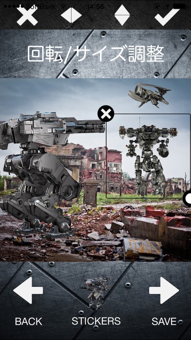 ロボットバトルフィールドフォトエディターは、いろんなロボットメカを写真上に設置できるアプリです。風景写真や人物写真にうまくフィットするようにデザインされたマシーンが60以上収録されています。サイズや向きの調整や、上下左右の反転も自在なので、あらゆる写真にレイアウトすることができます。