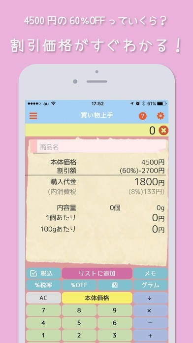 買い物上手 - 可愛い電卓でお得に買物しちゃおうのスクリーンショット