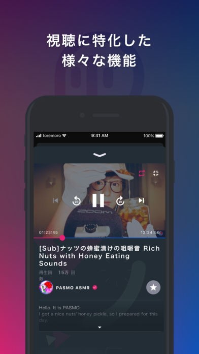 バックグラウンド再生ができるので、スマホで作業をしながらサウンドを流すことができます。ただし、この機能は「toremoro」と提携している配信者の動画を視聴したときのみ有効ですので、ご注意ください。
