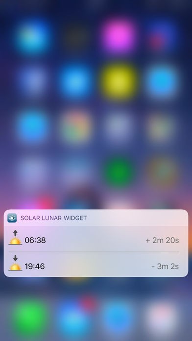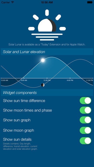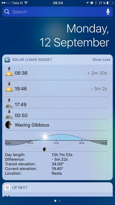 Solar Lunar Widget is a simple, elegant iOS widget that presents you with details of sunrise, sunset, moonrise, moon-set and moon phases. The widget displays detailed information about the Sun and the Moon, like the elevation graphs that shows exactly how the Sun and Moon will rise and set during the day at your current location and at the current date.