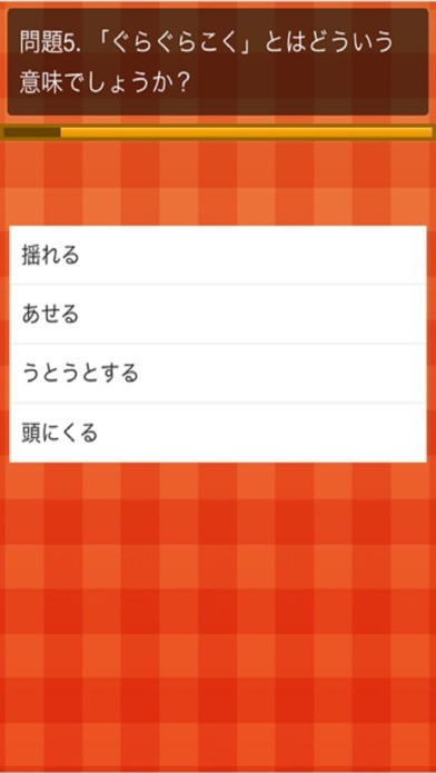 「博多弁方言クイズ!」は、博多に縁の無い方でも存分に楽しむ事が出来る、方言クイズアプリです。 操作方法はとても簡単で、アプリを起動すると可愛い女の子の画像下に1〜5までの博多弁クイズが表示されていますので、タップして選択します。1つの博多弁クイズにつき5問の問題が用意されています。 問題は解答4つの選択式です。正しいと思う解答をタップで選択してください。5問終了するとランクと正解率が表示されます。 尚、問題文と解答の間には制限時間のバーがあり、バーの色が無くなるまで解答しないと不正解となります。 博多弁クイズ1〜5はランダム出題では無く必ず同じ問題が出題されるので、繰り返し学習して博多弁を身につける事が出来ます。