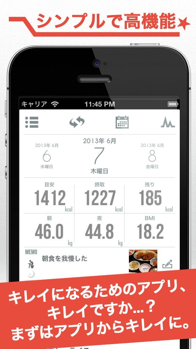 ダイエット中に日々の摂取目標カロリーを自動的に計算してくれるカレンダーアプリが「BeCalendar 痩せるカレンダー 」です。あらかじめダイエットの目標体重や体重などのデータを入力しておくことで、日々の摂取カロリーの目標数値を計算してくれるようになっているだけでなく、外食チェーンコンビニエンスストアの商品などのカロリーデータが約85000件も収録されているので、カロリーを計算しながら食事を楽しむことができるようになります。