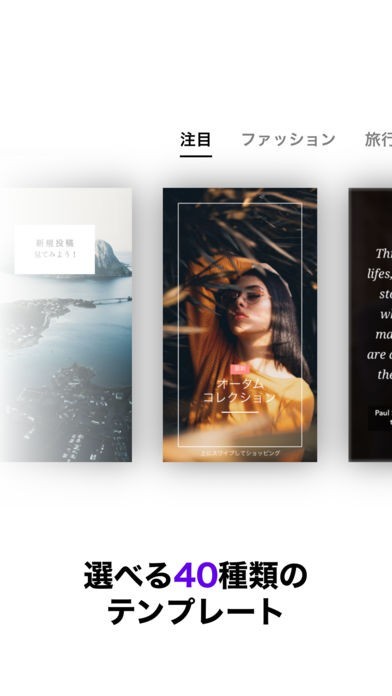 さまざまなスタイルのテンプレート40種類から選べ、どれも100%編集可