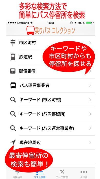 現在地や市町村、鉄道駅、キーワードなどから停留所を検索可能