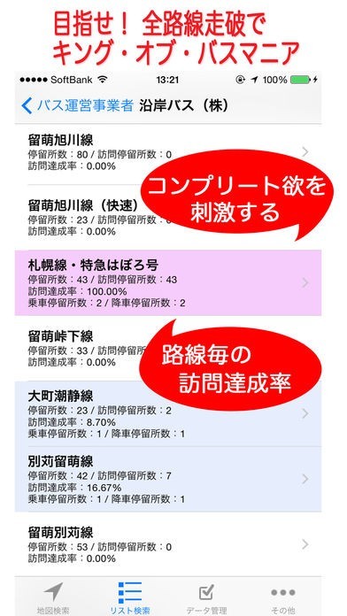 乗車した停留所を記録していくことで停留所訪問達成率や訪問済停留所数を管理できコンプリートまであとどれくらいかをすぐに把握できます。写真やメモを一緒に残しておけばその時の様子がすぐに思い出せます。