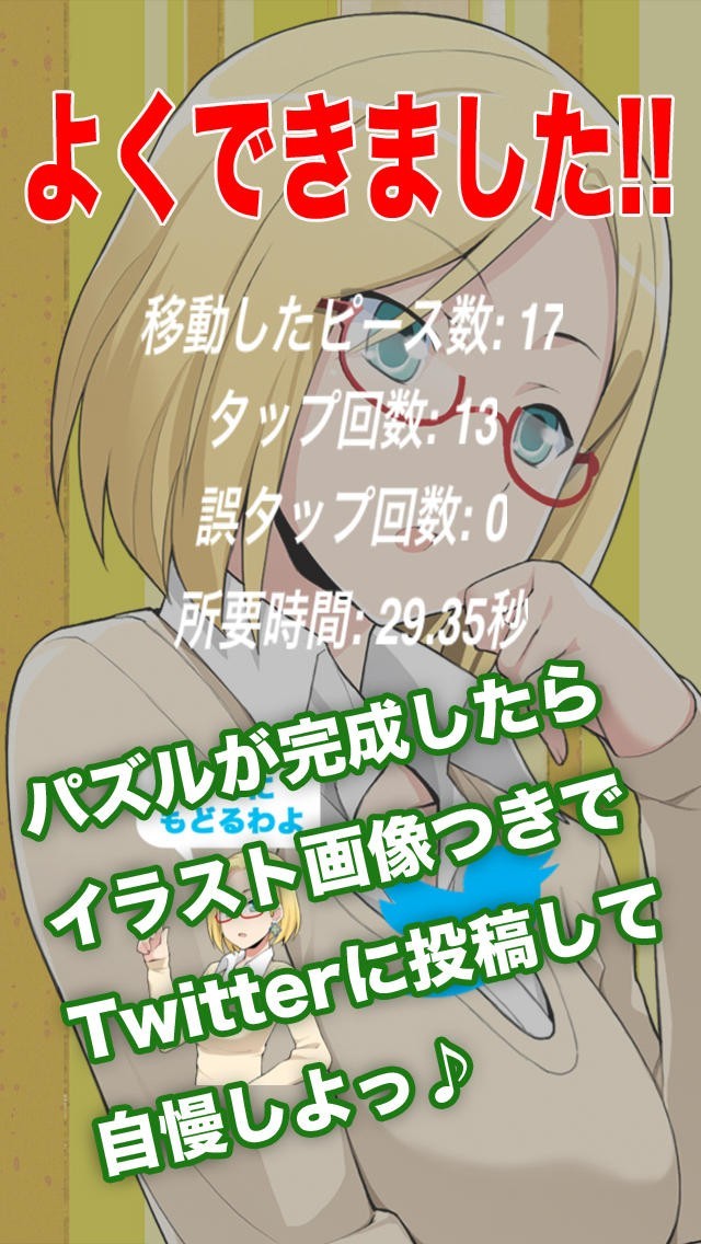 いろんなスタイルのクラウディア窓辺がいて、しかもどれも可愛い!アニメが好きな人や可愛い二次元キャラが好きな人は、注目せざるを得ないパズルアプリです。もし、プレイ中に席を外さなければならない時は、「中断ボタン」でゲームをストップできるのも魅力です。ですから、「スキマ時間で使えるゲームアプリは、簡単にクリアできるものばかりだからつまらない」と思っている人でも、じっくりとパズルゲームができるのです。なお、本アプリで完成させた画像は、Twitterに投稿することができます。したがって、ゲームをクリアした喜びを「誰かと共有したい!」時に使っても面白いでしょう。