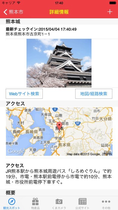 検索した観光スポットをブックマークしたり、地図URLを付加してメーラーを起動したり、チェックインして訪問履歴が付けられます。Twitterに訪問したことをツイートすることもできます。