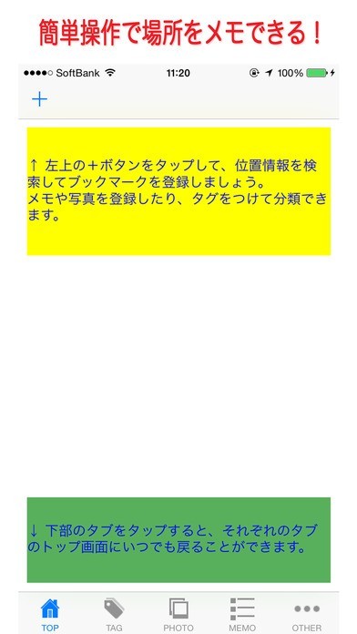 プラスボタンから現在の位置情報をメモや写真とともに登録しておける