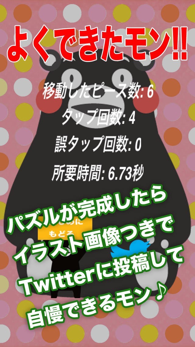 パズルのピースが見事そろって完成したら、完成させたイラストと成績をTwitterに投稿してみんなに自慢できるよ!
