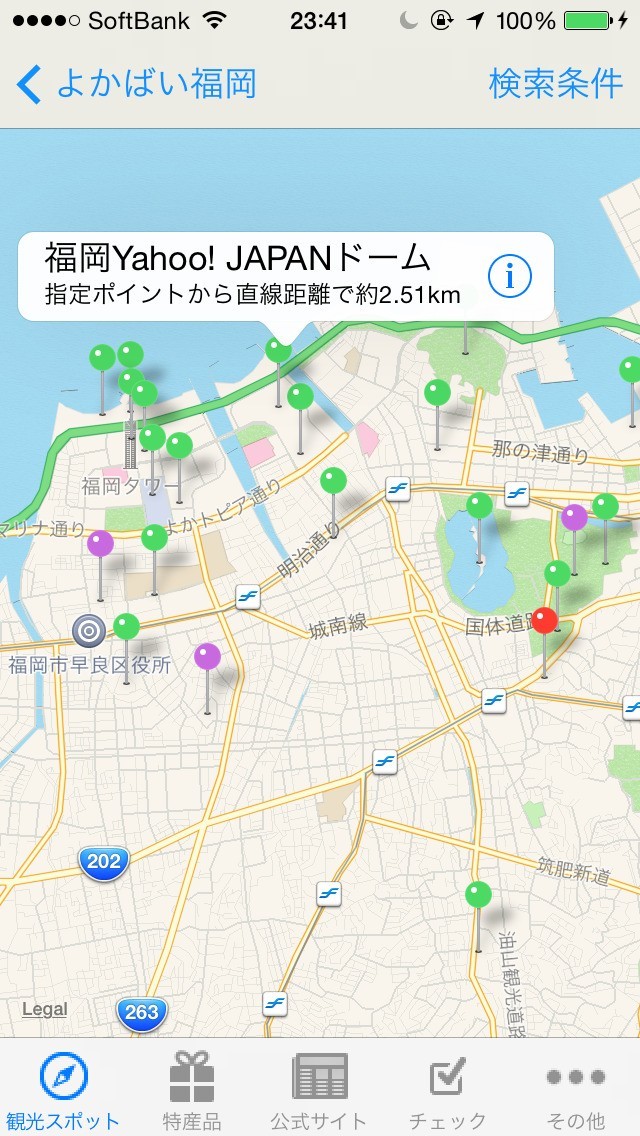 (1) 地図から検索(指定ポイントから観光スポットまでの直線距離表示あり)