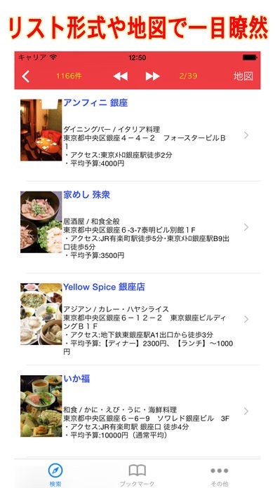 ジャンル別に話題の飲食店をリサーチ出来るようになっています。また地図の表示に対応しているので、店舗の位置や最寄り駅までのルートも素早く把握する事が可能でしょう。