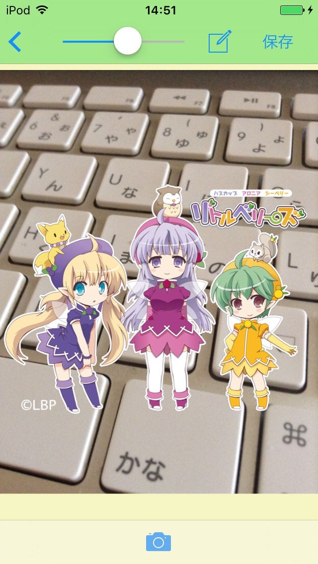リトルベリーズのキャラクターの紹介のほか、内蔵カメラで撮影した写真とキャラクターのイラストを合成して、フォトアルバムに保存したり、TwitterやLINEに投稿できます。