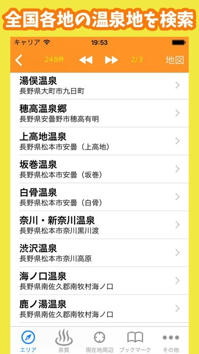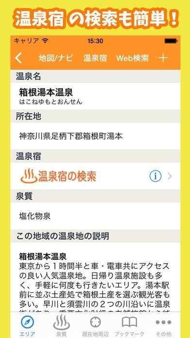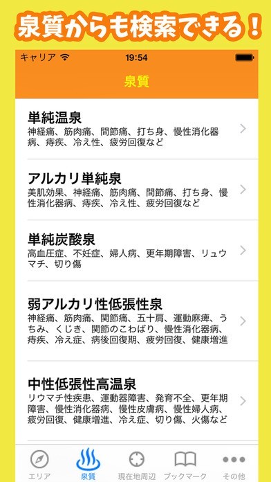 実際にスーパーモーニングのiPad特集で紹介されるなど注目を集めているアプリです。 エリアを選択することによってそこにある温泉がリスト形式で表示され、気になったものがあればタップすることで温泉についての詳しい情報を知ることが出来るだけではなく、「温泉宿の検索」から泊まることができそうな場所を探し出すことが出来ます。 また、「泉質」をタップすることで効能などから温泉を選ぶことが出来るので、病気や怪我で悩んでいる方はそこから探し出して改善をはかる事ができます。 また、今すぐ温泉に入りたくなった場合には「現在地周辺」によって今の場所から近い温泉を紹介してくれます。