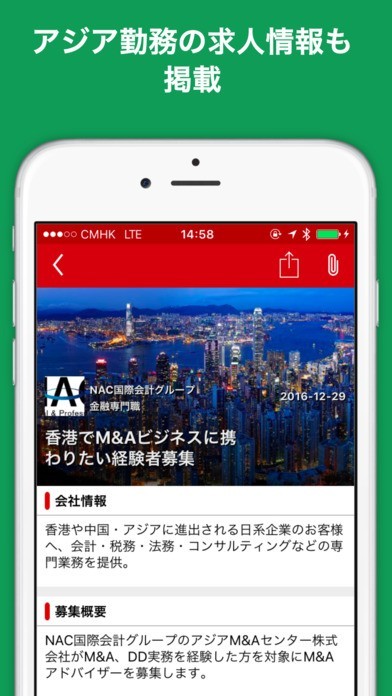 メリット:アジアに関する最新のニュースを知ることができて、且つ求人情報から応募までできるようになったアプリです。他のインターネットサイトやアプリよりも情報が多いです。