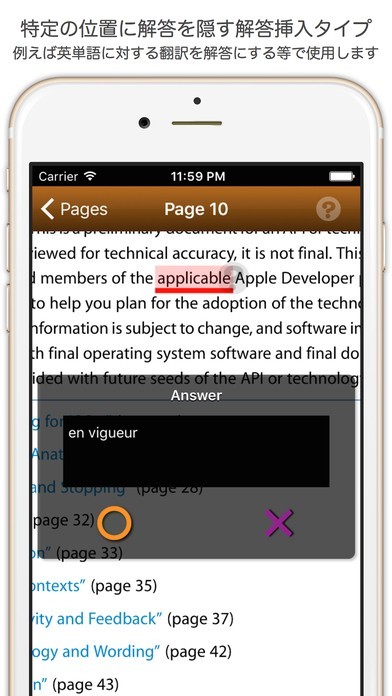 ◎通常のマーカータイプだけでなく、任意の文章に解答を埋め込んで単語帳のように使用できる解答挿入モードもあります。
