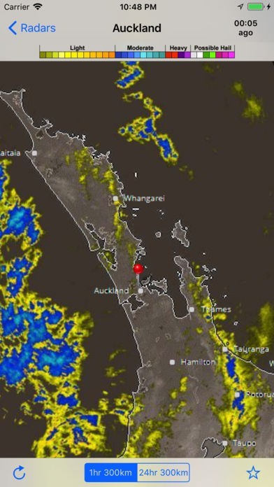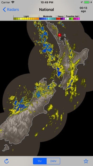 App Storeより引用Rain Radar New Zealand displays up to the minute rain radar data. Full screen mode, landscape support, pinch and pan zooming, favourites list, GPS location, nearest radars list, national radar, plus more.