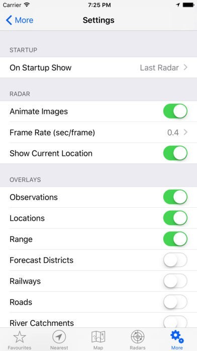 At start up choose to display the last radar viewed, your favourite radar, or the closest radar. No tapping, just get the radar you want to display instantaneously.