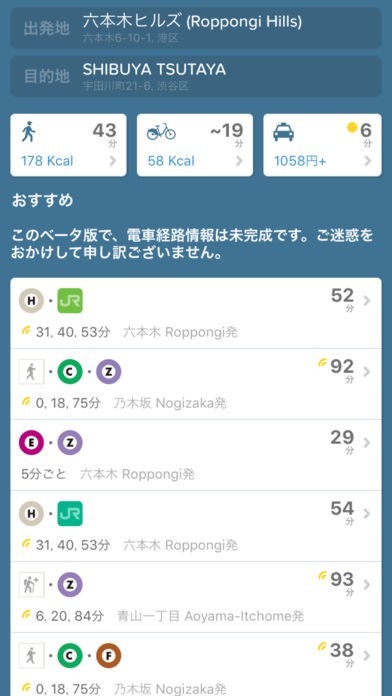 東京だけではなく、世界中の都市で利用することが出来るので、旅行などで海外によく行く方にはとても役に立ちます。 現在地と目的地を指定することで、そこまで徒歩で何分かかり、何カロリー消費するのかを表示してくれるので、ダイエットをしようとしている方にも向いていますし、他にもどのような交通手段を使えるのかを知ることも出来ます。 他にも運行情報などをツイッターなどから拾ってきて知ることができるので、問題が起きている時には把握することが可能です。 さらには、目的地までルート表示して丁寧に教えてくれるので、迷う心配が無く、初めての道でも安心して通ることができます。 他にはタケコプターで何分かかるかなどといった遊び心がある情報も見ることが出来るので、空想にふける使い方も出来ます。