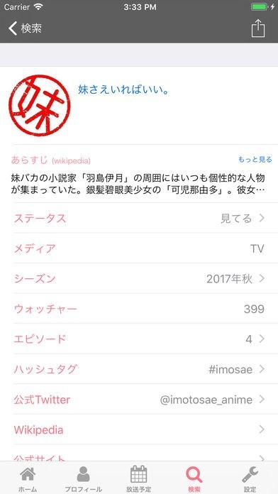 検索機能でサクッと見たいアニメが見れますし、そのアニメが今シーズン何まで出ているかや、放送されている進行具合まで調べられます。また、公式サイトやウィキペディアなどにもアクセスすることができてとても便利です!