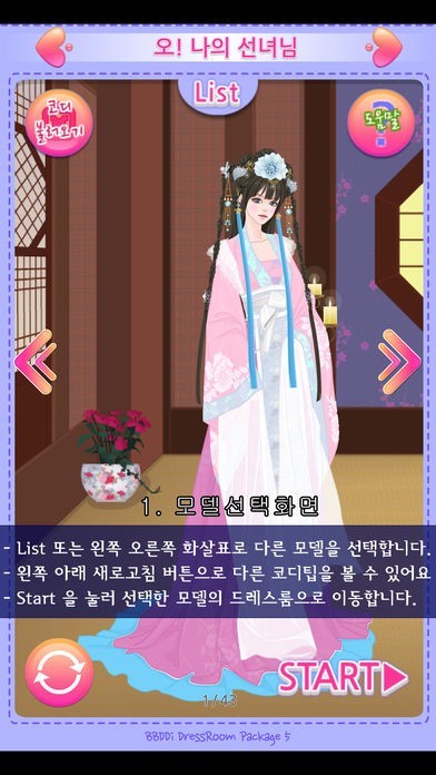 상큼한 패션 로맨스 쁘띠마르샹에서 만든 드레스룸 패키지 다섯번째 앱입니다. 패키지5도 패키지2와 마찬가지로 한국의 전통옷인 한복을 주제로 시대별로 한복을 코디할 수 있게 드레스룸이 구성되어 있습니다.