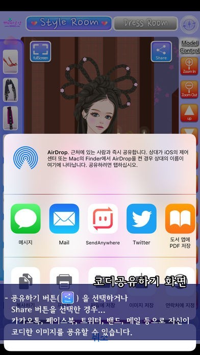 17. 이미지 공유기능을 제공합니다. 메뉴를 클릭해서 나오는 메뉴에서 Share My Coordination (마이코디 공유하기) 를 선택하시면 페이스북이나 트위터, 카카오톡이나 지메일등에 내가 꾸민 이미지를 공유하실 수 있습니다