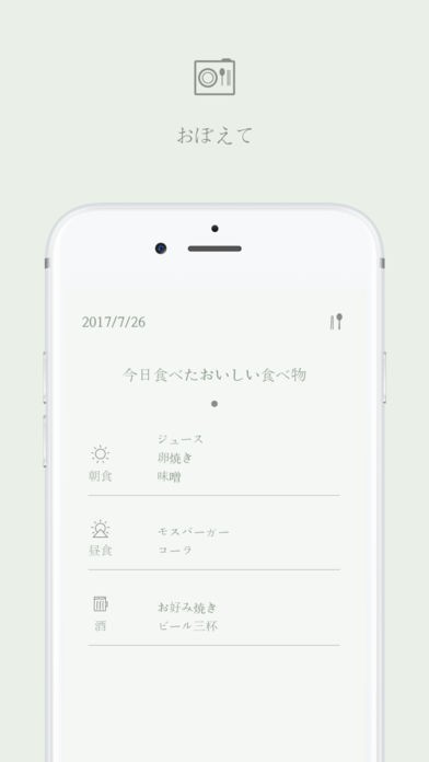 01. 飲み食いレコード。1日の食事日記。朝食、昼食、夕食、間食、水、アルコール、それらすべてを写真付きで記録できます。