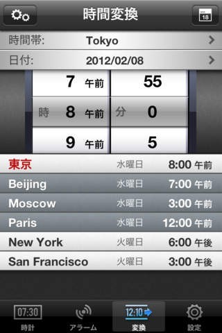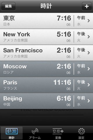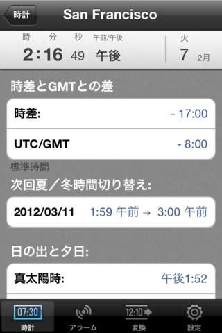 世界時計は時刻変換を含めて多数の機能を内蔵された強力なアプリケーションソフトで、世界の230カ国から19万2千の都市名がそのデータベースにあります。時刻同期機能や目覚ましアラーム、夏/冬時間切り替え情報などを簡単に表示できます。