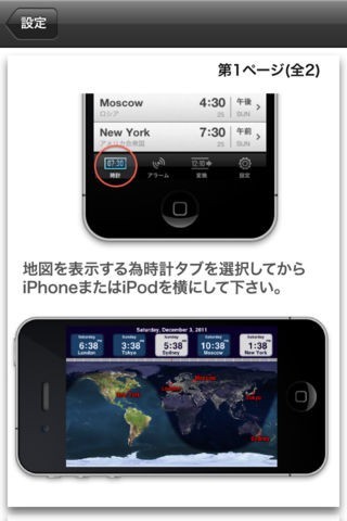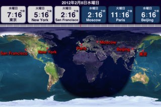 • 魅力的なデザインの昼夜世界地図(iPhoneとiPod touchの場合は時計タブに切り替えしてから装置を横長にしてください。)