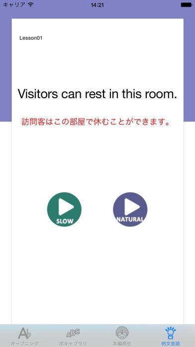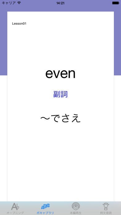 ●ボキャブラリ:Lessonで登場する重要な単語とその意味が表示され、[再生]ボタンをタップすることでネイティブスピーカーの実際の発音が再生されます。フリックで先のページに進めます。