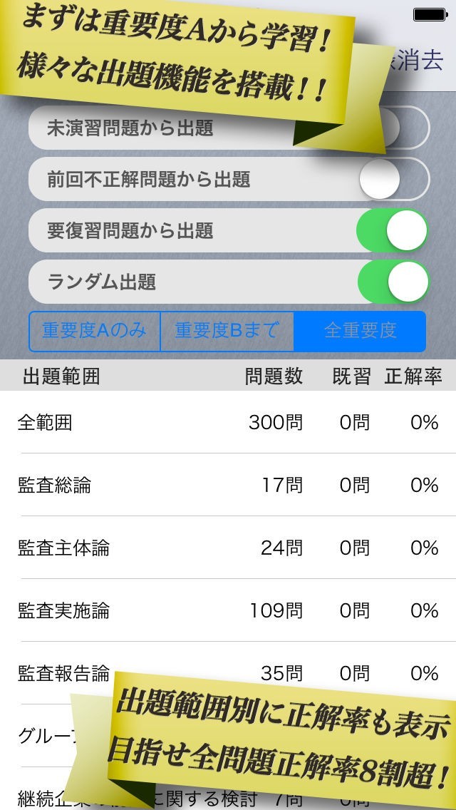 問題が重要度から掲載。正解率も表示され要復習・記憶済みも確認可能