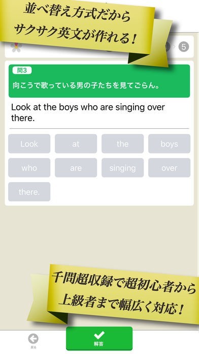 英語を勉強したいけど、復習とかが面倒だし、時間がかかる。そんな人にこのアプリはピッタリです。問題を解くとき、指で簡単に並び替えができるので、ゲーム感覚で楽しみながら復習できます。復習することで定着度がアップし、さらに英語学習が楽しくなります。