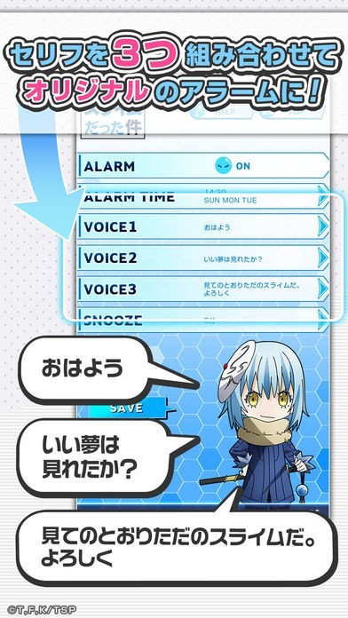 転スラアラーム 〜リムル編〜はアニメ「転生したらスライムだった件」の人気キャラクターリムルと大賢者の声で起こしてくれるアプリです。新規撮り下ろしボイスも多数収録されています。