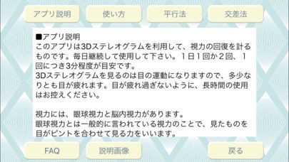 アプリ内には数々の3Dステレオグラムが収録されており、手軽に脳内視力を鍛える事が可能です!また、このアプリ内には視力回復について沢山の解説が収録されており、初心者の方でも安心して使用する事が可能です!平行法や交差法といったやり方も解説されているので、近視や遠視といった様々な症状に対応しています!