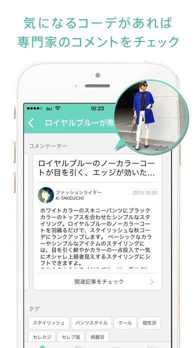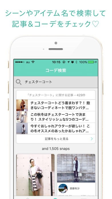 持っているアイテムや買おうか悩んでいるアイテムの名前で検索。専門家の書いた記事やファッショニスタのコーディネートを参考にすることができます。