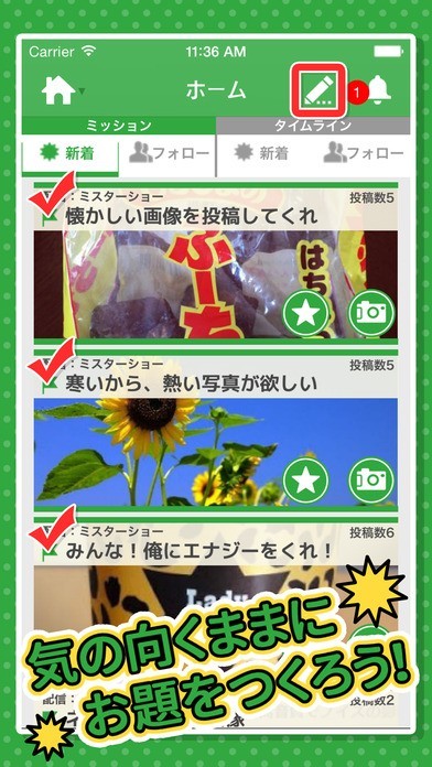 ミッションにあった写真を撮影したり、ペンの形のアイコンからミッションを自分で作ることが可能