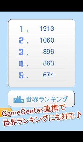 GameCenterと連携して、アカウント登録をすれば、世界中の人々と、タイムを競ってバトルしたりすることができます。ワールドレコードホルダーになるまで何度も挑戦できます。