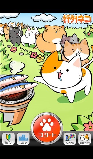 前作ネコ探しの続編として世に送り出されたアプリ「行列ネコ」は、ほのぼのとしてキュートなネコが行列を作る癒し系ゲームです。しかし、そんなかわいらしいにゃんこたちを眺めているだけではいけません。行列は七輪で焼いているサンマを狙っているため、奪われないように追い払うのが目的となります。方法は4種類のうち同じネコをタップすることですが、いっぺんに追い払う数が多いほど高得点となるシステムです。また、10ポイント毎に発動できるのがイヌの「全力ワン」で、画面中の全ネコを一掃できます。