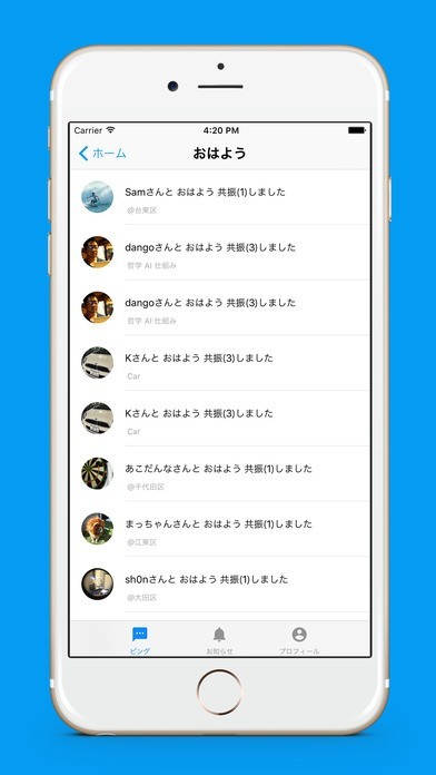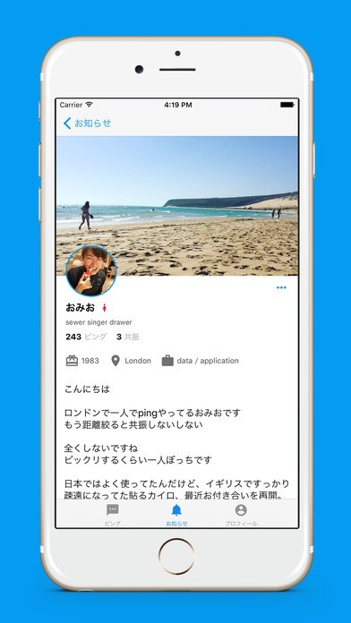 4文字だけで自分の心を表現するコミュニケーションツール「ピング」 投稿できるのは4文字に限定されており、「たのしい」や「眠りたい」などの直感的な言葉を発信できるようになっています。 フォローや「いいね!」などの機能をあえて省略されており、人目を気にすることなく自分の気持ちだけをシンプルに発信することができるでしょう。 まったく同じ4文字を発信した人のプロフィールだけが閲覧可能となるのも、このツールのユニークなポイント。 同じ人と4回共振することで、4文字だけで会話を交わすダイレクトチャットの利用が行えます。