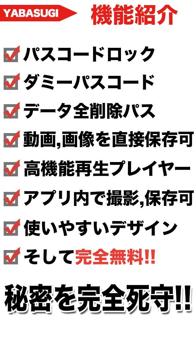 このアプリを使えば、「パスコード」を入力することによって保存しておいたデータを閲覧できるようになります。よって、他の方に見られたくないようなものがスマートフォン内にある人がそのデータを隠すのに役立ちます。 また、画像だけではなく「動画保存」もすることができ、アプリ内で閲覧することができることから、手早く視聴できて便利です。 加えて、アプリ内で「写真撮影」をしてそのまま保存したりも出来ます。 さいごに、「ダミーパスコード」を設定できるので、他の方がロックを解除したと思い込ませて、何も隠し事はないと確認させることが出来るので、浮気を疑っている妻などに使わせることによって、争いごとが起きずにすみます。