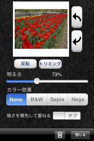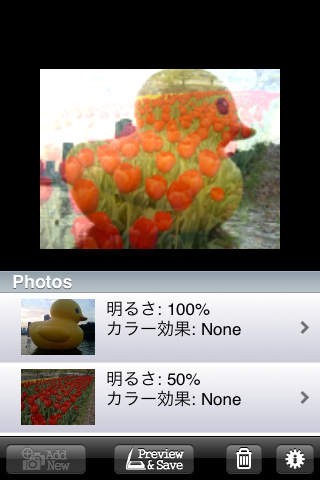 写真を重ねて一枚の写真にすることがアプリです。アイデアによって、とても素敵な作品を作り上げることができます。例えば一枚の写真は背景として大きな怪獣の写真を使い、もう一枚に子どもたちの写真を使うとします。すると怪獣の中に子どもたちがいるような写真を作成することが出来ます。このように様々な可能性を秘めたアプリなので、撮影時に作品のイメージを決めてから撮影するのも楽しいです。また、写真のカラーや明るさなどを設定することも可能です。