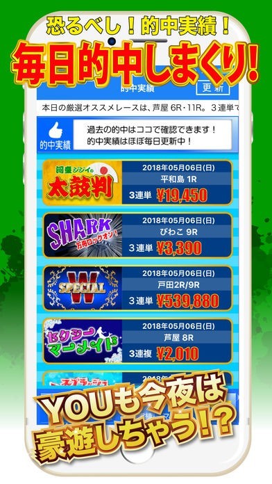 選りすぐった豪華舟券師たちによる競艇予想アプリです。高的中率で有名なメンバーばかりですので、その予想は頼りになります。的中率が高いだけでなく高配当狙いの舟券師もいますので、いろんな角度からの予想を知ることができます。