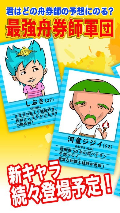 予想師には視点の異なる魅力的なキャラクターがたくさんいます。データ予想を得意とする「ボーニャー」、熱血的な予想を展開する「しぶき」、熟練の知識で勝負する「河童ジジイ」など自分にあったキャラクターを見つけましょう。