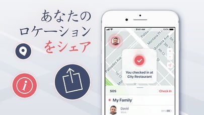 自分の現在地、そして相手の現在地を共有することで、家族に限らず友人達とも、いざという時の安全確認ツールに使えます。チェックインボタンがあることで素早く正確に位置情報の交換が可能です。