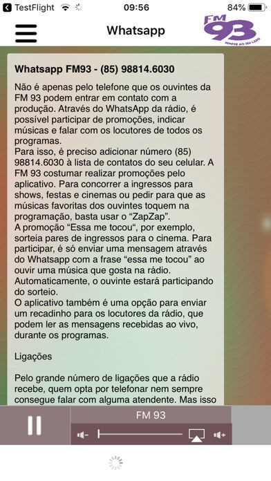 App Storeより引用A FM 93 traz em sua essência a popularidade cearense, com um toque especial de cultura regional e alguns tons de inovação no meio rádio, tornando-a cada vez mais próxima dos ouvintes, seja com promoções interativas, notícias quentinhas ou da valorização dos grandes sucessos da música nacional e internacional.