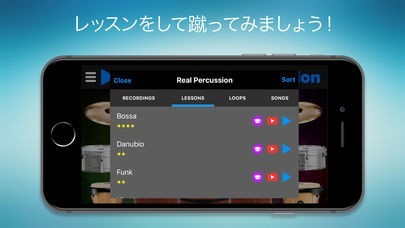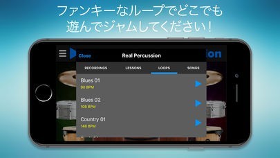 REAL PERCUSSIONでは、20のリズムレッスンと、演奏方法を教えるチュートリアルを提供しています。Funk、Country、Jazz、Oriental、Pop、Reggaeなど、15個のループもついています。