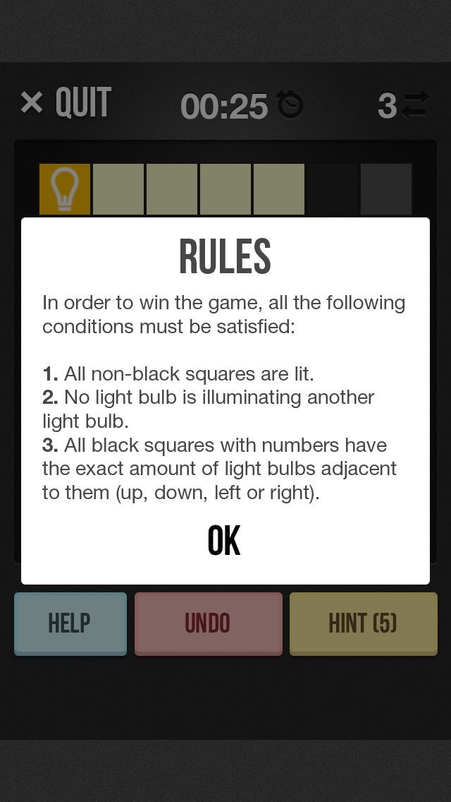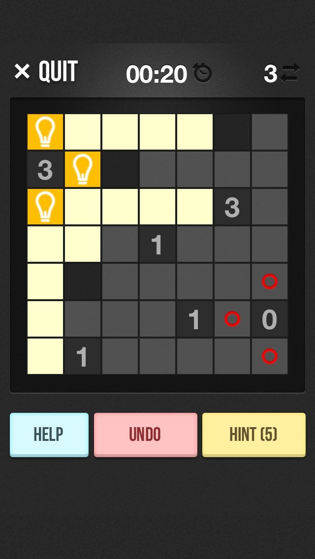 Also known as Akari, LightUp is an addicting puzzle which objective is to lit every empty cell of the board using light bulbs.